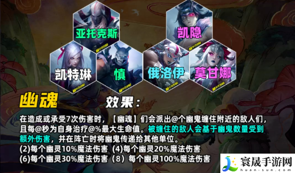 【幽魂】弈子造成7次伤害后会快速治疗20%最大生命值,并派遣一个幽灵扰乱附近的敌人。扰乱的敌人被攻击时会受到额外魔法伤害。敌人在死亡后会传递扰乱