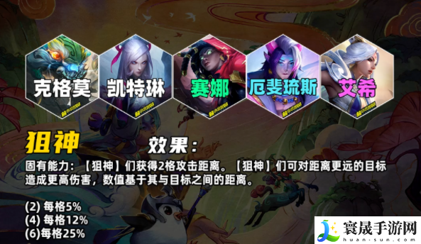 固有能力:狙神获得2格攻击距离狙神根据与目标之间的距离获得百分比额外伤害