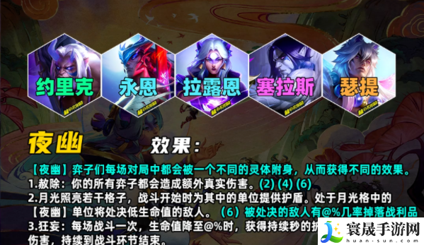 · 月光照亮若干格子:战斗开始时为其中的单位提供护盾。处于月光格中的【夜幽】单位将处决低生命值的敌人。