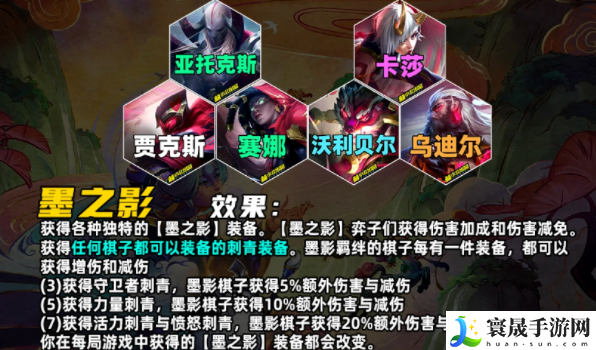 获得各种独特的【墨之影】装备。【墨之影】弈子们获得伤害加成和伤害减免。获得任何棋子都可以装备的刺青装备。墨影羁绊的棋子每有一件装备,都可以获得增伤和减伤
