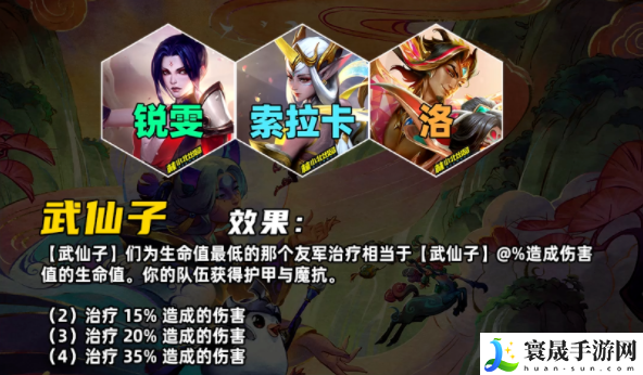 你的队伍获得护甲与魔抗。【武仙子】会根据造成伤害值的百分比对生命值最低的那个友军治疗