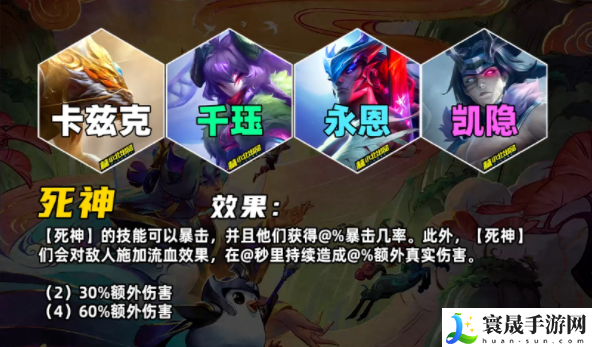 【死神】的技能可以暴击,并且他们会获得额外暴击几率。此外,【死神】们会对敌人施加流血效果,在n秒里持续造成额外真实伤害
