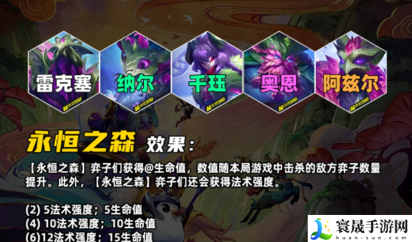虽然和S4的名称一样,但是效果不同。敌方弈子死亡后,获得一层【土壤】层数,永恒之森弈子会从每层【土壤】层数中永久获得生命值加成,妥妥的成长性羁绊;此外每过4秒,还会获得法强