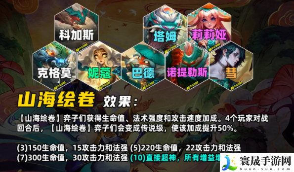 和S4的羁绊名称一样,但是效果不同,山海绘卷的弈子会获得生命值、攻击力和法强,经过4场战斗后,山海绘卷】弈子们会变成传说级,增益效果提升50%,实战中脚下有个和S4三国羁绊一样的圈