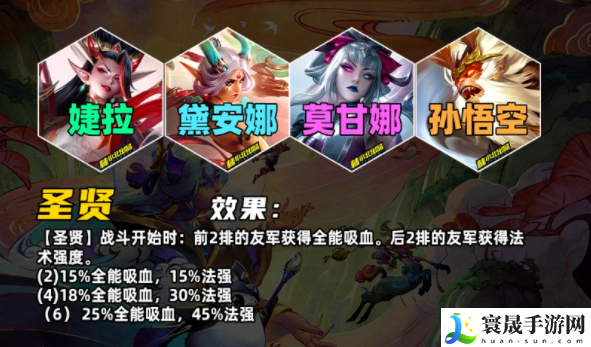 战斗开始时,弈子基于所处的格子位置获得加成处于前两排,获得全能吸血处于后两排,获得法强加成