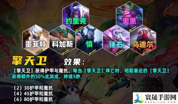 擎天卫的弈子会获得双抗加成,并且阵亡后,最近的巨像的弈子会获得额外50%双抗加成,持续5秒