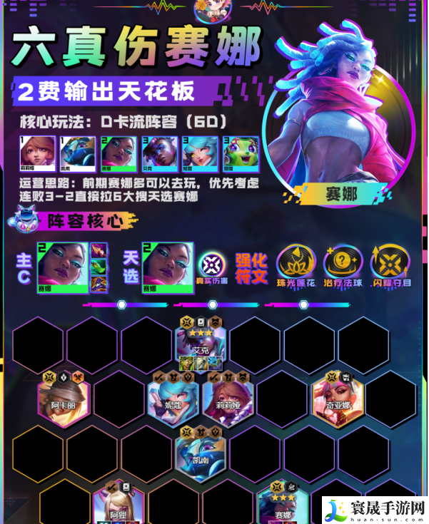 云顶之弈六真伤赛娜阵容怎么玩?这套阵容在成型之后伤害非常高,很多玩家想了解六真伤赛娜阵容怎么玩,那么小编下面就来详细分享下六真伤赛娜阵容的玩法,感兴趣的话就来看看吧。