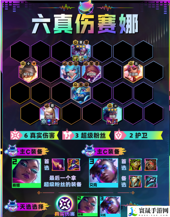 2.阵容羁绊:4/6真伤3KDA3超级粉丝2护卫2秘术