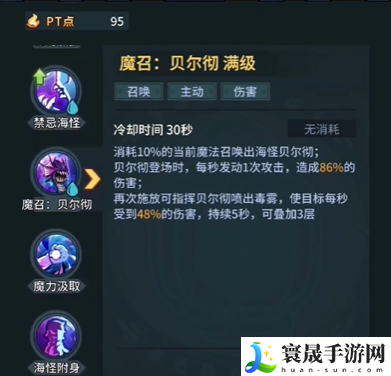 1、消耗当前的魔法值召唤海怪贝尔彻,且每秒将造成一次攻击。