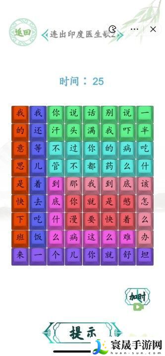 按照上面歌词去点击文字,就可以连出印度医生歌2了,顺利通关的。这就是汉字找茬王印度医生2攻略,希望对大家有所帮助。