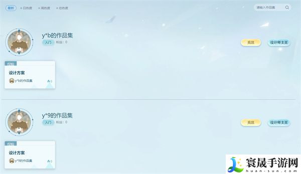 2、在设计师页面,玩家可以可能到一些有名的设计师的作品,当然也是可以按照最新、日热度、周热度和总热度进行排序的;