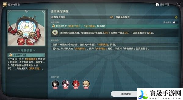 解析:战斗模式为虚构叙事类模式,但是这关精英怪较多,生存压力不小,罗刹属于必带角色。在异变机制的帮助下,我们需要手动调整电视机的表情,灵活运用队伍中,扩散、单攻、群攻多种类型的技能,尽量多的完成三消,自动是个笨蛋。