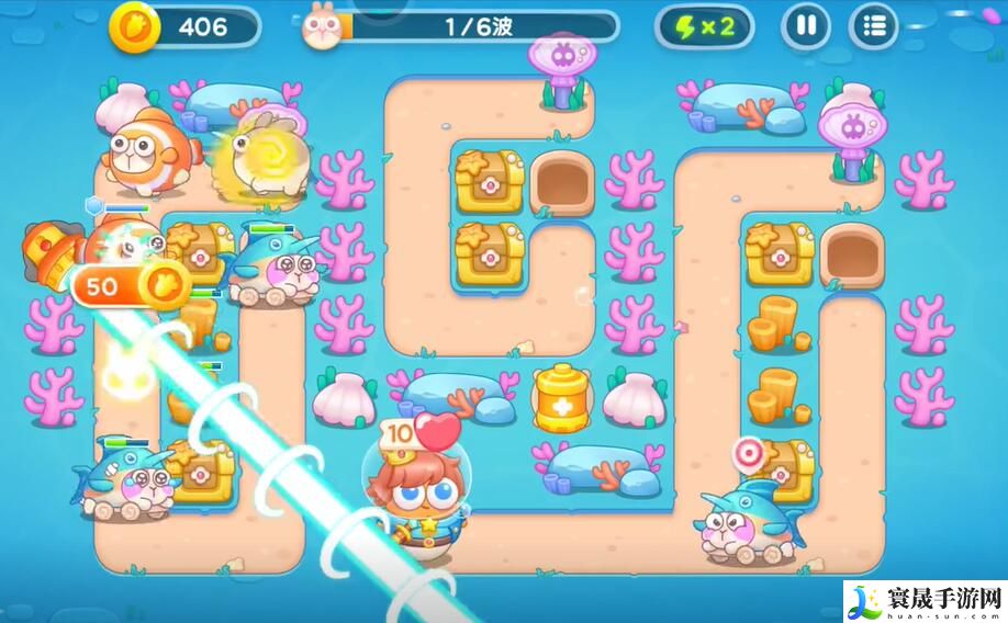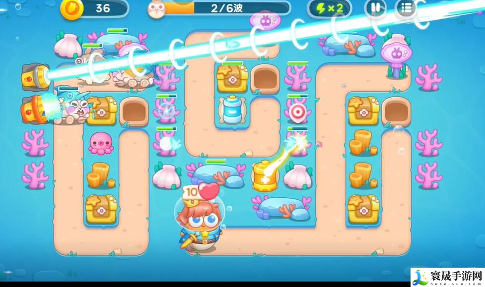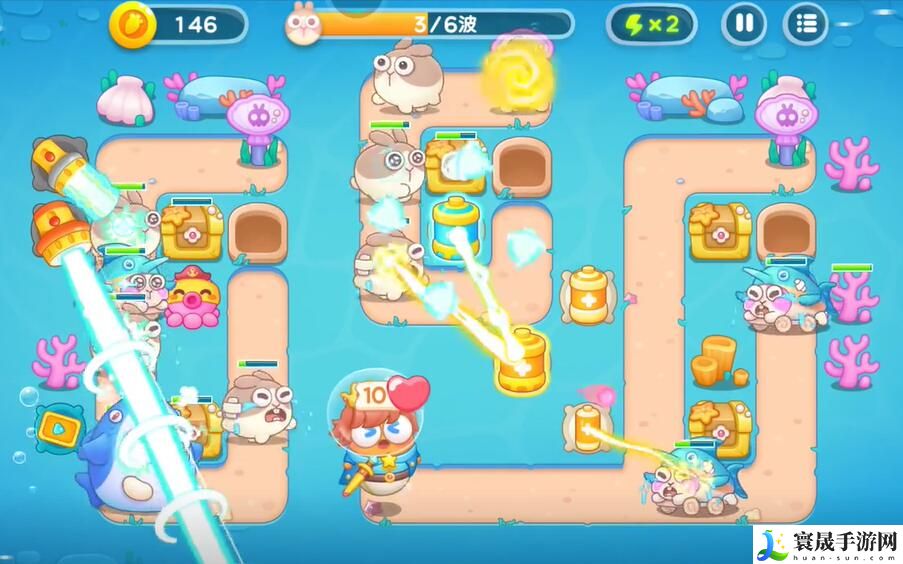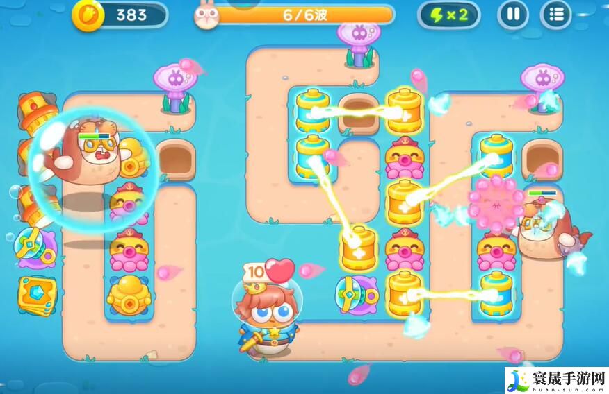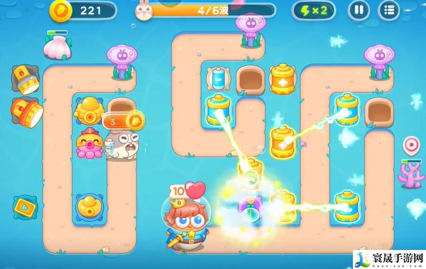 6、在右侧建造更多的章鱼塔进行输出,左侧建造泡泡塔进行控制,消灭掉所有的兔子即可完成本关挑战。
