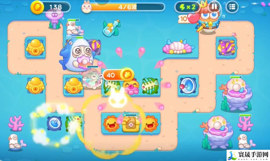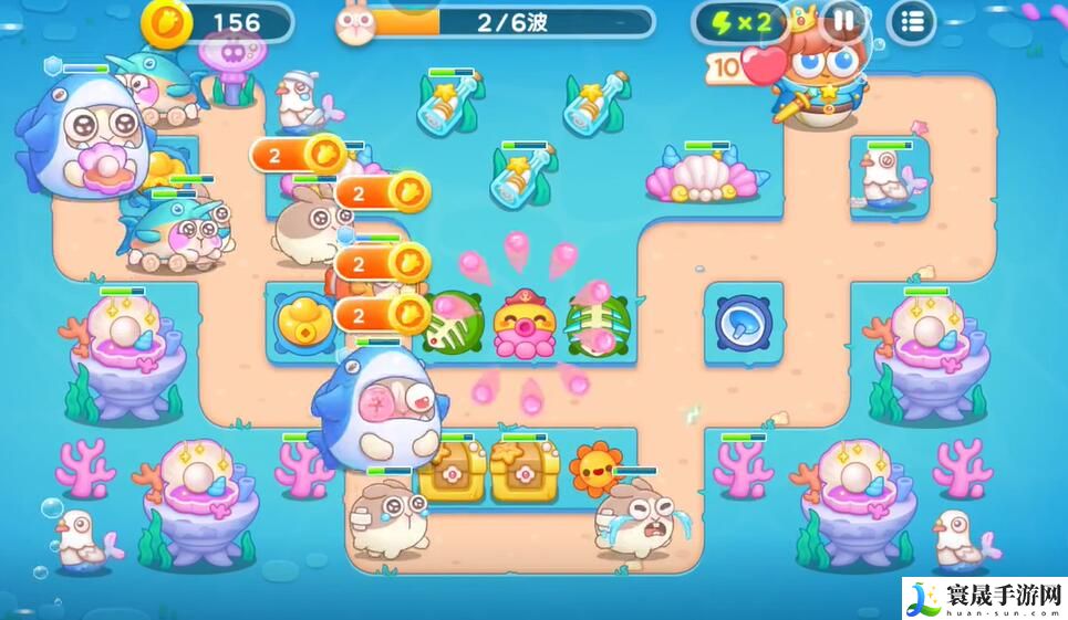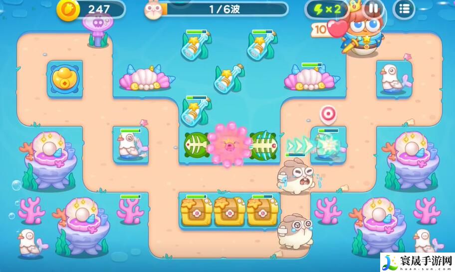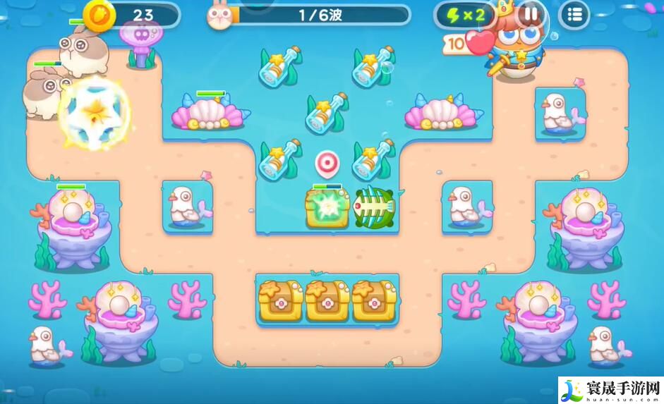 1、在中间的宝箱右侧建造一个鱼骨塔对宝箱进行攻击,利用关卡提供的左上角的元宝塔清理兔子。