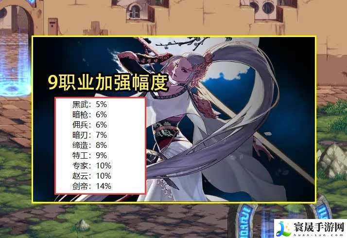 首先职业平衡方面,有关于黑武、暗枪、佣兵、暗刃、缔造、特工、专家、赵云、剑帝这9个职业的加强幅度也是曝光了!分别是5%、6%、6%、7%、8%、9%、10%、10%,以及14%。