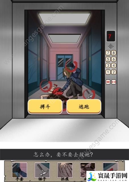 场景一:先在7楼的电梯中找到:手套、锤子、抓痕、血迹、高跟鞋这五处疑点,然后选择【逃跑】;