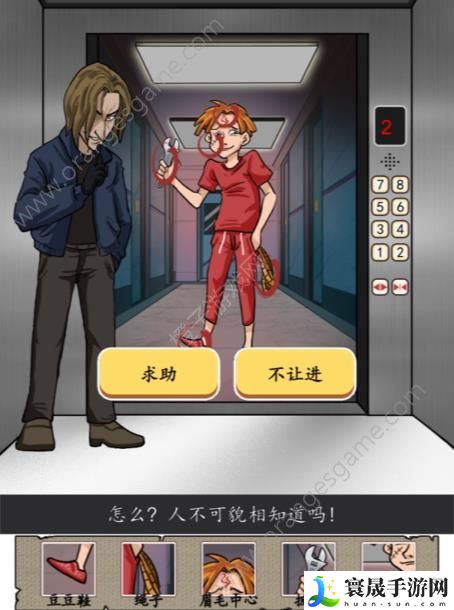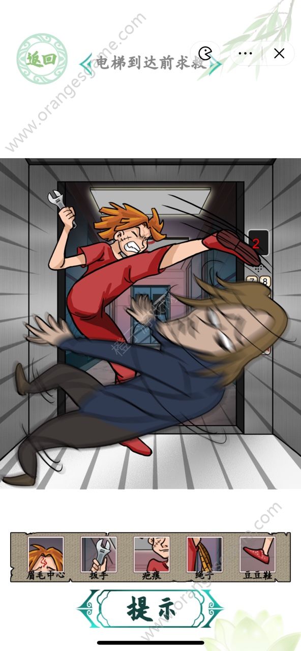场景三:找到第2层电梯中小孩身上的:豆豆鞋、绳子、眉毛中心、扳手、疤痕这五处,然后选择【求助】。