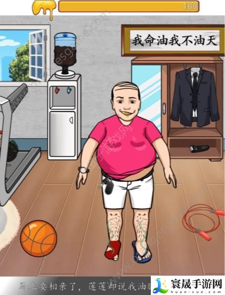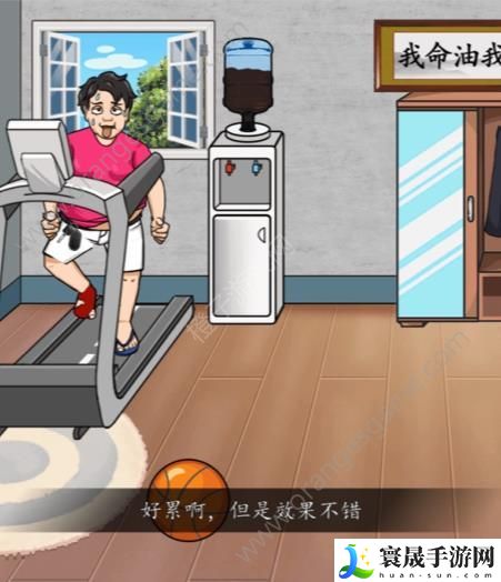 2、拖动鸡至窗户,再拖动大郎上跑步机、点击手机召唤女教练、拖动篮球给大郎