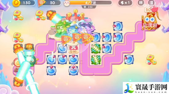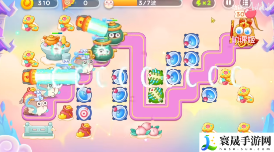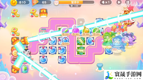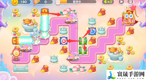 4、玩家还是要沿着神仙的移动路线来放炮塔,电母的镜子、雷公的棋子尽量清理一下,葫芦可以不用管,中间还会有仙女和天兵,玩家一倍数慢慢打,在起点再加手电筒、毒针。