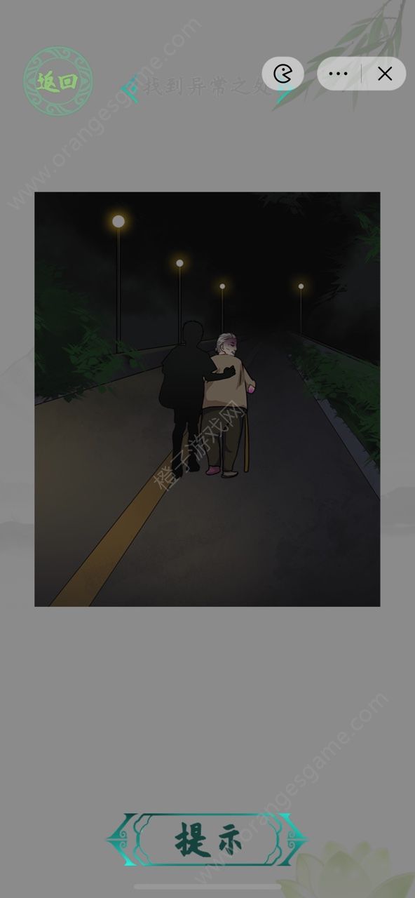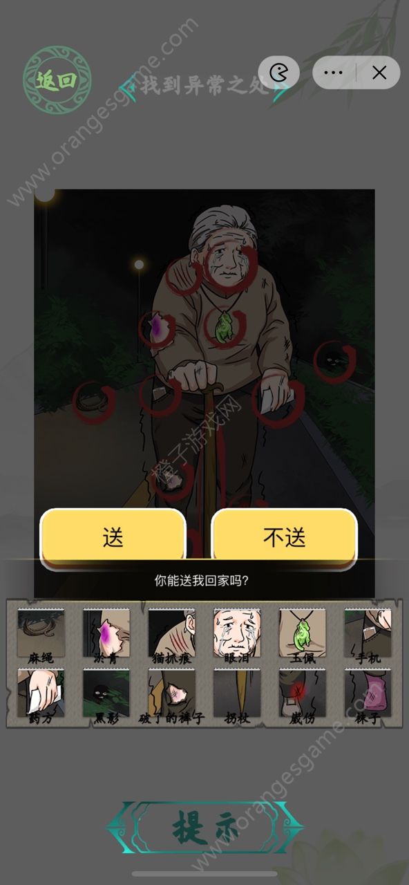 1、找到路边老奶奶12处异常:眼泪、猫抓痕、淤青、玉佩、药方、黑影、崴伤、袜子、麻绳、手机、拐杖,破了的裤子。