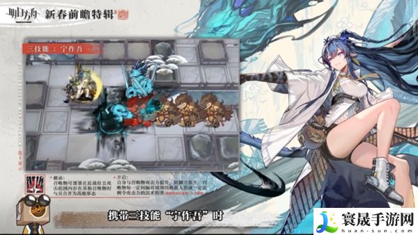 被动可召唤并部署在远战位,攻击造成法术伤害,主动在攻击范围内对两名敌人造成一定比例的法术伤害和束缚;