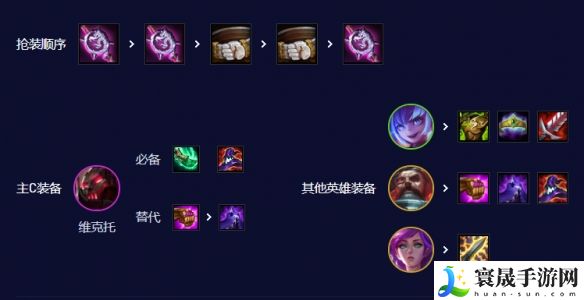 安妮3肉,不追3,钱用来上9,维克托1启动+2输出,最好青龙刀帽子法爆,打刺客可以换一个夜刃,电刀随便找个法师副C带着。