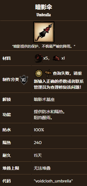 暗影伞(Umbralla)是饥荒联机版中的一种可制作物品,消耗 5 个纯粹恐惧、 1 个暗影碎布制作。属于夏季物品、雨具分类和暗影术分类,需要由暗影术基座制作原型体解锁。