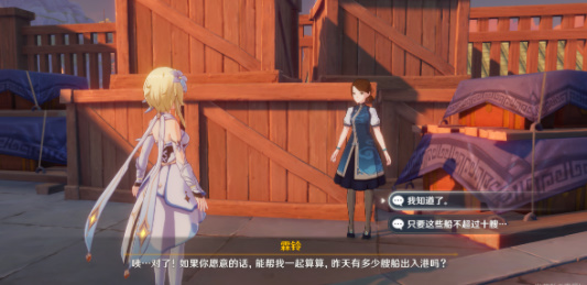 1、我们接取任务后来到璃月港与霖铃对话,发现是霖铃因为写诗耽误了统计港口船只的出入情况,要我们帮助他计算具体数据;