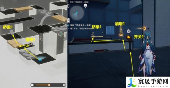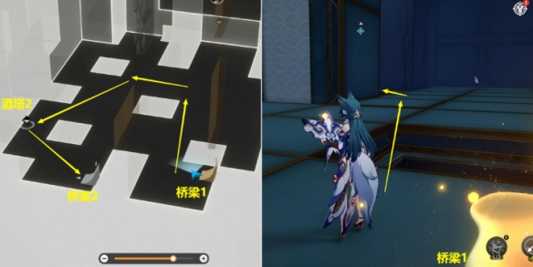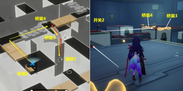 (3)从【桥梁2】上来后,打开【开关2】,从【桥梁3】下去获得【酒塔3】的次数后,再从【桥梁3】返回到【桥梁3】和【桥梁4】中间位置。