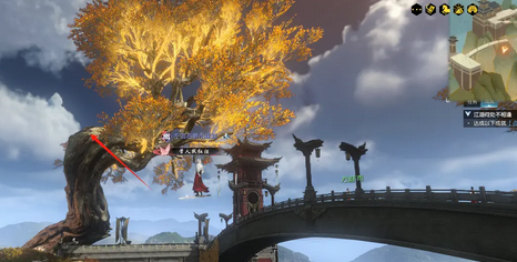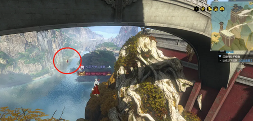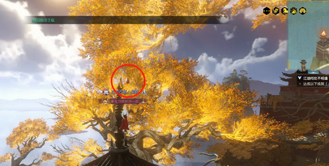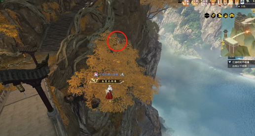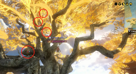 9、转动视觉到下图的位置,瞭望亭塔尖前往,到达之后转动视觉对着树,往下飞在洞口获得:第十一个炎冰石;