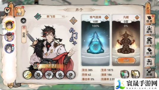 弟子实力受词条天灵根影响。为弟子搭配合适词条可有效提升战斗力。请关注弟子潜能培养,以便在江湖中所向无敌。