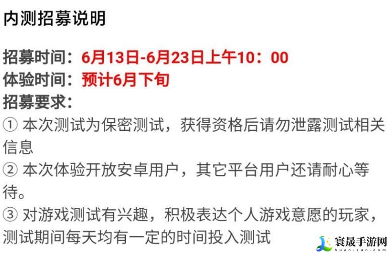 招募时间为6月13日至6月23日上午10点,预计体验时间为6月下旬
