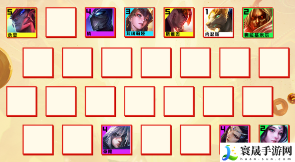 1、阵容组成:风女、吸血鬼、狗头、刀妹、泰隆、莫甘娜、慎、斯维因+任意新春使者