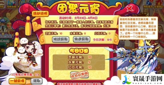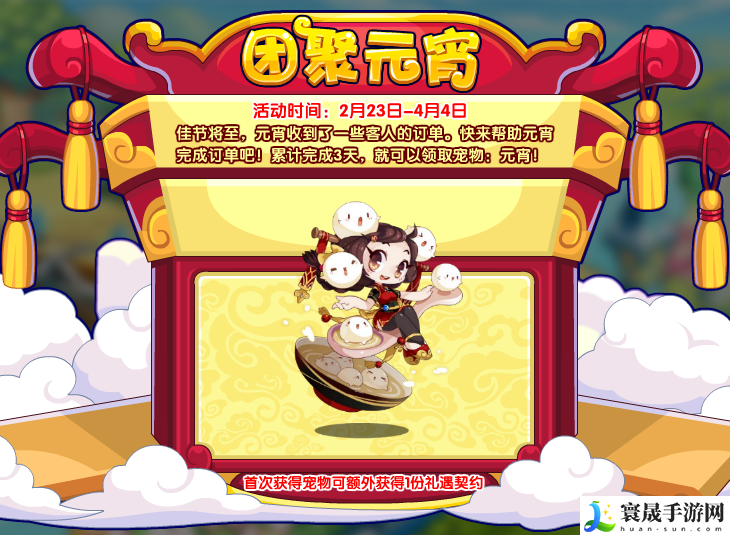 佳节将至,元宵收到了一些客人的订单。快来帮助元宵完成订单吧!累计完成3天,就可以领取宠物:元宵!