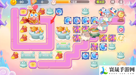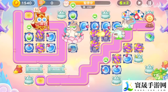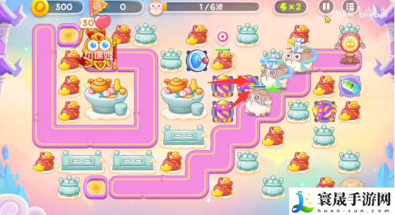 1、开局在右侧的道路左侧放两个烟花和一个雷达,道路右侧放一个烟花炮,先锁定左侧的钱袋打,dawn放烟花炮,第一波就会有莲花兔,有钱在起点放一个毒针;