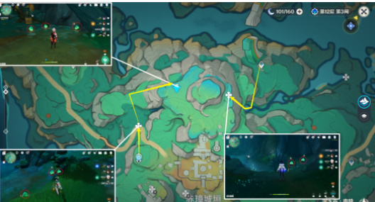 一、灵濛山13个,采集路线如下图所示,其中有一处需要玩家使用兽肉召唤乌龟,在乌龟的背上就有着一定数量的清水玉。
