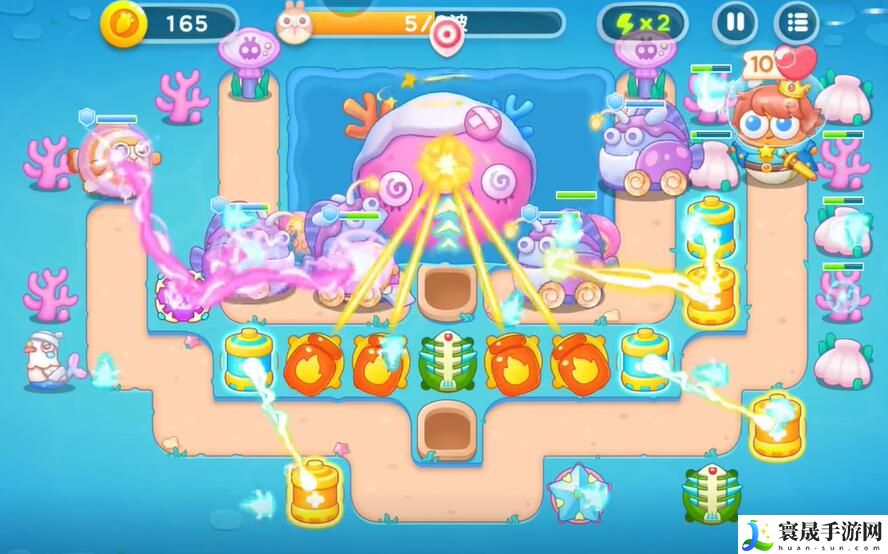 5、在中央建造一个鱼骨,右下角建造一个减速塔对兔子小怪进行攻击。