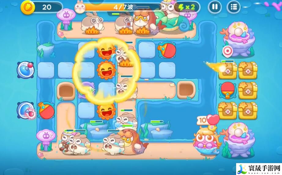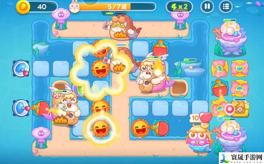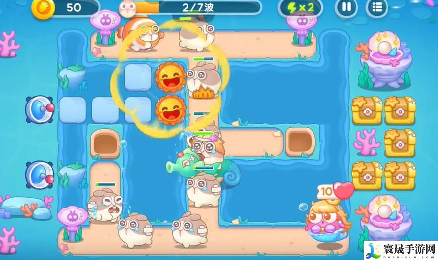 5、在水池中补充向日葵进行攻击,同时利用右侧被摧毁的宝箱获得的蝴蝶结对周边的障碍物进行攻击。
