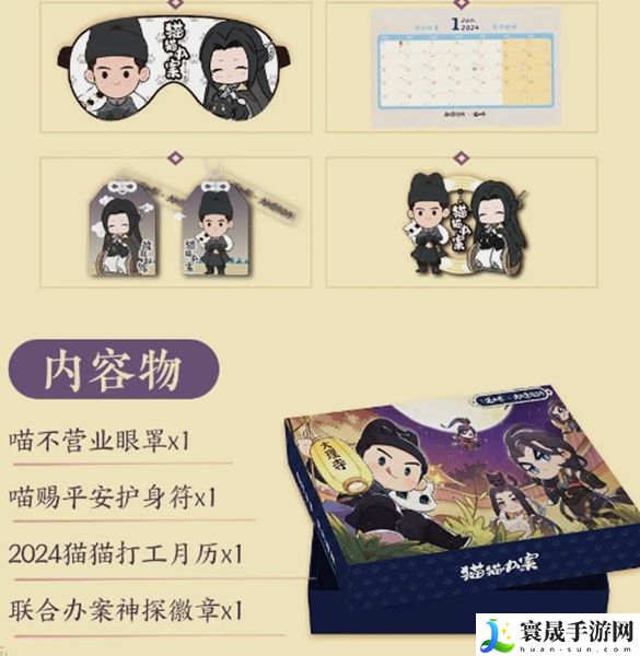 礼盒内包含:括喵赐平安护身符*1、喵不营业眼罩*1、联合办案神探徽章*1、2024年猫猫打工月历*1