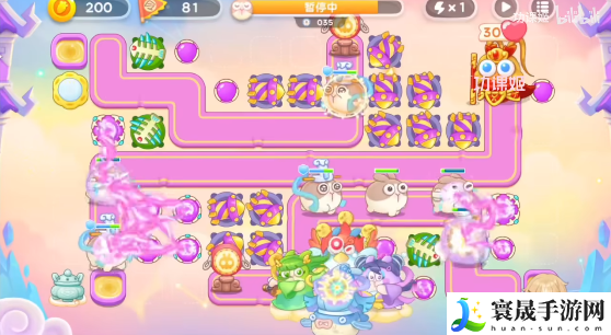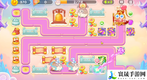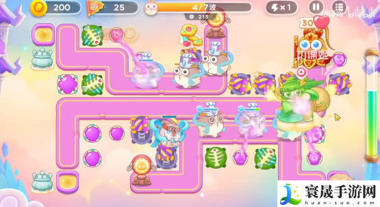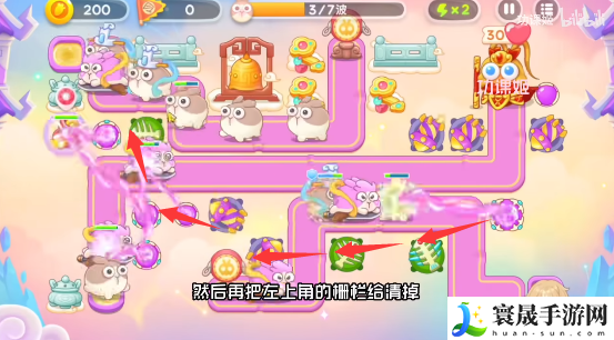 4、第一个神仙是拿葫芦的,玩家可以锁头打,顺着路线放炮塔,在右上角萝卜边上多放烟花炮,有飞飞兔,打完之后是合体神仙,这个有点难,不怎么能锁头,还有粉兔别漏掉了。