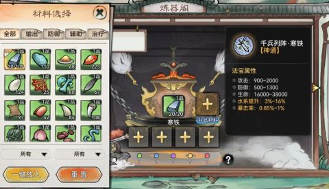 同时要注意炼制法宝的属性。左边的是主属性,而右边的是法宝的具体技能效果。大家一定要注意这一点,否则炼制除了不能用的法宝,白白浪费许多资源。