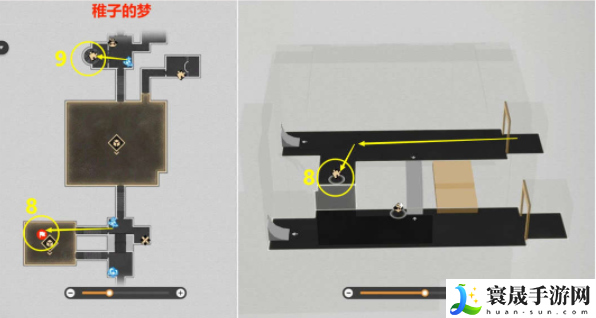 (3)从【桥梁2】上来后,再从右边【门1】出去后,就可以到右边第10个【梦境迷钟】位置房间了。