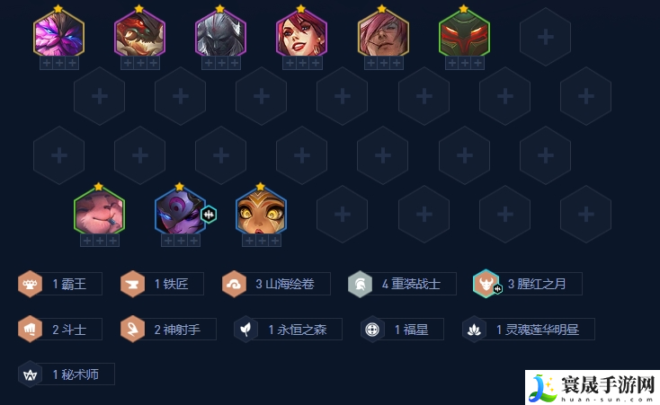 羁绊组成:轮子妈猩红天选,4重装 33秘猩红 3猩红 3山海 2斗士 2神射手
