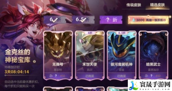 金克丝的神秘宝库,抽出你的专属折扣!5个未拥有的传说皮肤和精选皮肤等你以超值优惠带回家~