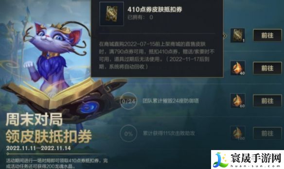周末对局享福利,11月11日至11日14日,召唤师们只需参与1场对局,即可领取1张额度410点券的抵扣券!完成任务更有龙魂水晶奖励相送,让你收获满满快乐~