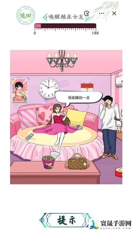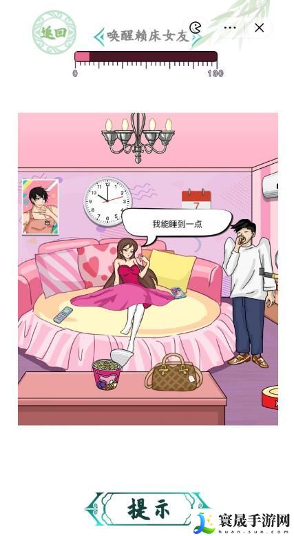 1、汉字找茬王唤醒赖床女友点击窗帘和时钟。
