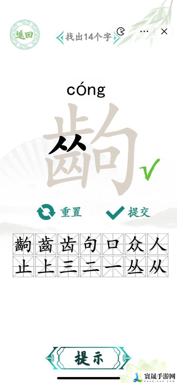 1.汉字找茬王齣找出14个字是:齣chu、齒chi、齿、句、口、众、丛、从、人、止、上、三、二、一。