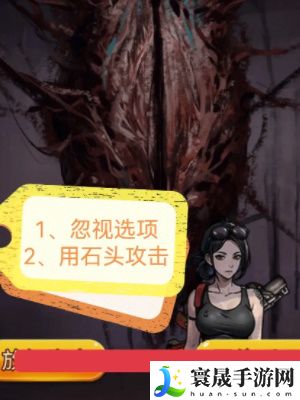 6、接着来到新的场景中会遇到怪物,我们使用地上的石头进行攻击。接着出现选项,不做选择而是继续使用石头攻击怪物;