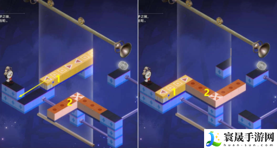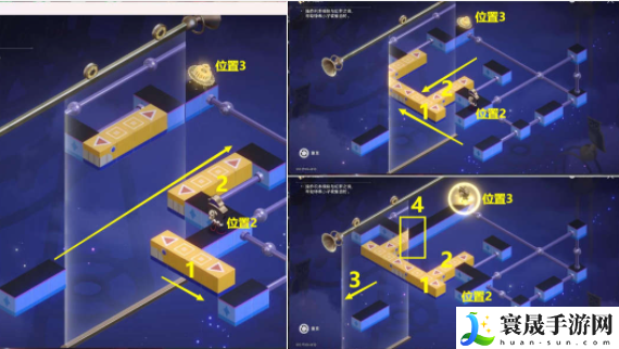 (2)将1黄色模块移到右上,将2镜子移动往右下移动,使3位置拼接到一块(形成一个直角道路),【钟表小子】会从位置2到位置3,解密完成。