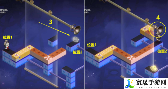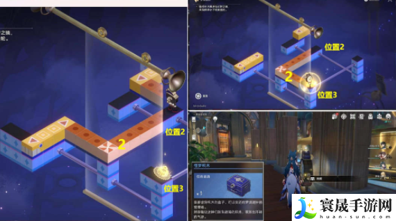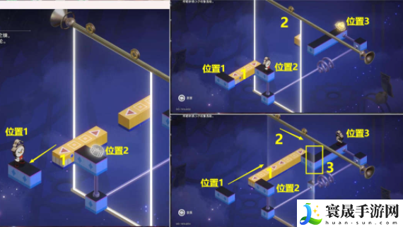 (2)将3黄色模块移到离右上还有1格的位置,将2镜子往左下移动到滑竿顶端5位置,【钟表小子】会从位置2到位置3,解密完成。